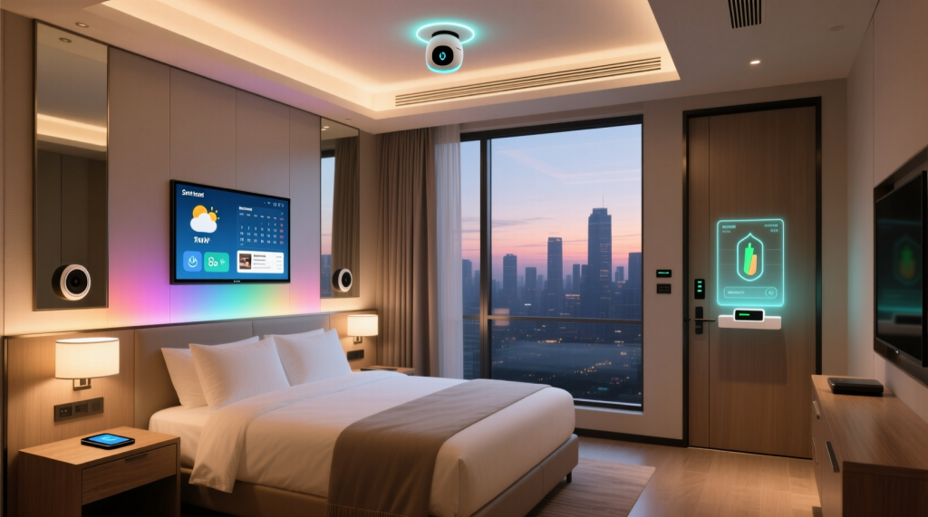- تبلتها و پنلهای کنترل: یک تبلت اختصاصی در اتاق به عنوان مرکز کنترل عمل میکند. میهمانان میتوانند از طریق آن خدمات مختلفی مانند درخواست حوله اضافه، رزرو رستوران یا اسپا، و دسترسی به اطلاعات محلی را انجام دهند.